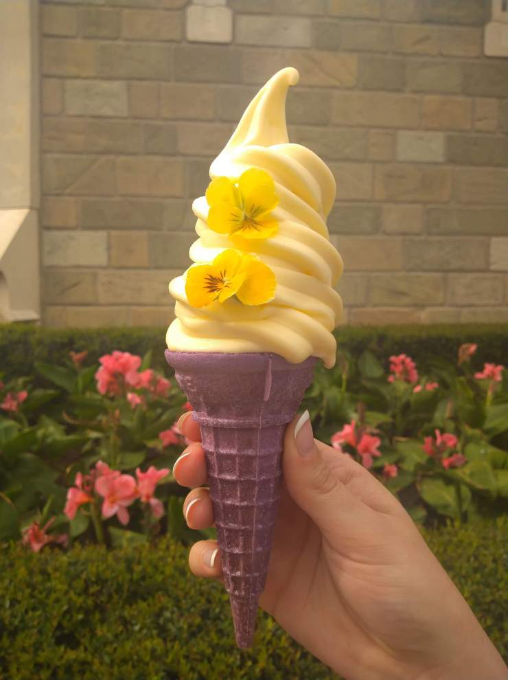 The lost princess cone really hit the spot in that 90°F weather. Purple cone was cool, as were the actual flowers stuck to the side of it. I’ve never eaten a flower before, so they were strangely… Velvety and crunchy, but the Dole whip ice cream was very good. It even had subtle edible glitter on the outside of the ice cream piles. Would definitely eat it again.